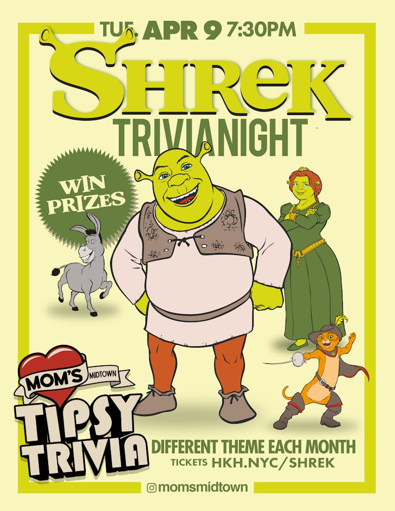 How well versed are you in ogre? Do you know the geography and topography of Duloc and the Far Far Away? Get ready to test your knowledge of Princess Fiona, Donkey, The Poison Apple Pub and all things Shrek at Mom's Tipsy Trivia in Midtown and you'll have a chance to win prizes.