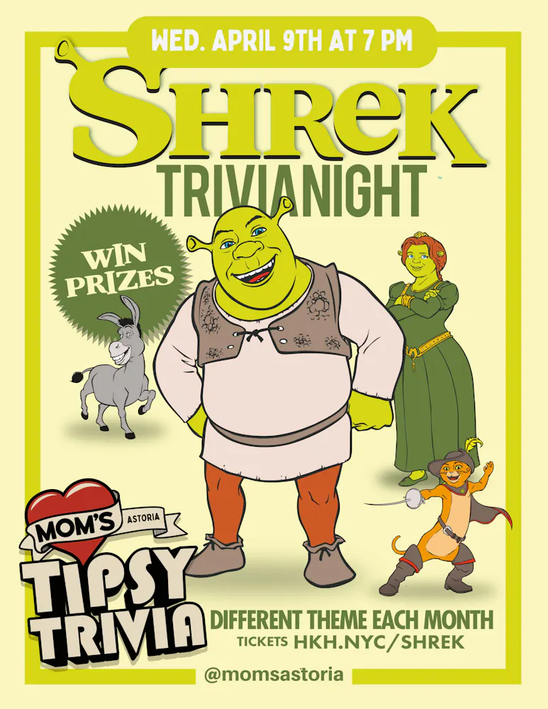 How well versed are you in ogre? Do you know the geography and topography of Duloc and the Far Far Away? Get ready to test your knowledge of Princess Fiona, Donkey, The Poison Apple Pub and all things Shrek at Mom's Tipsy Trivia in Astoria and you'll have a chance to win prizes.