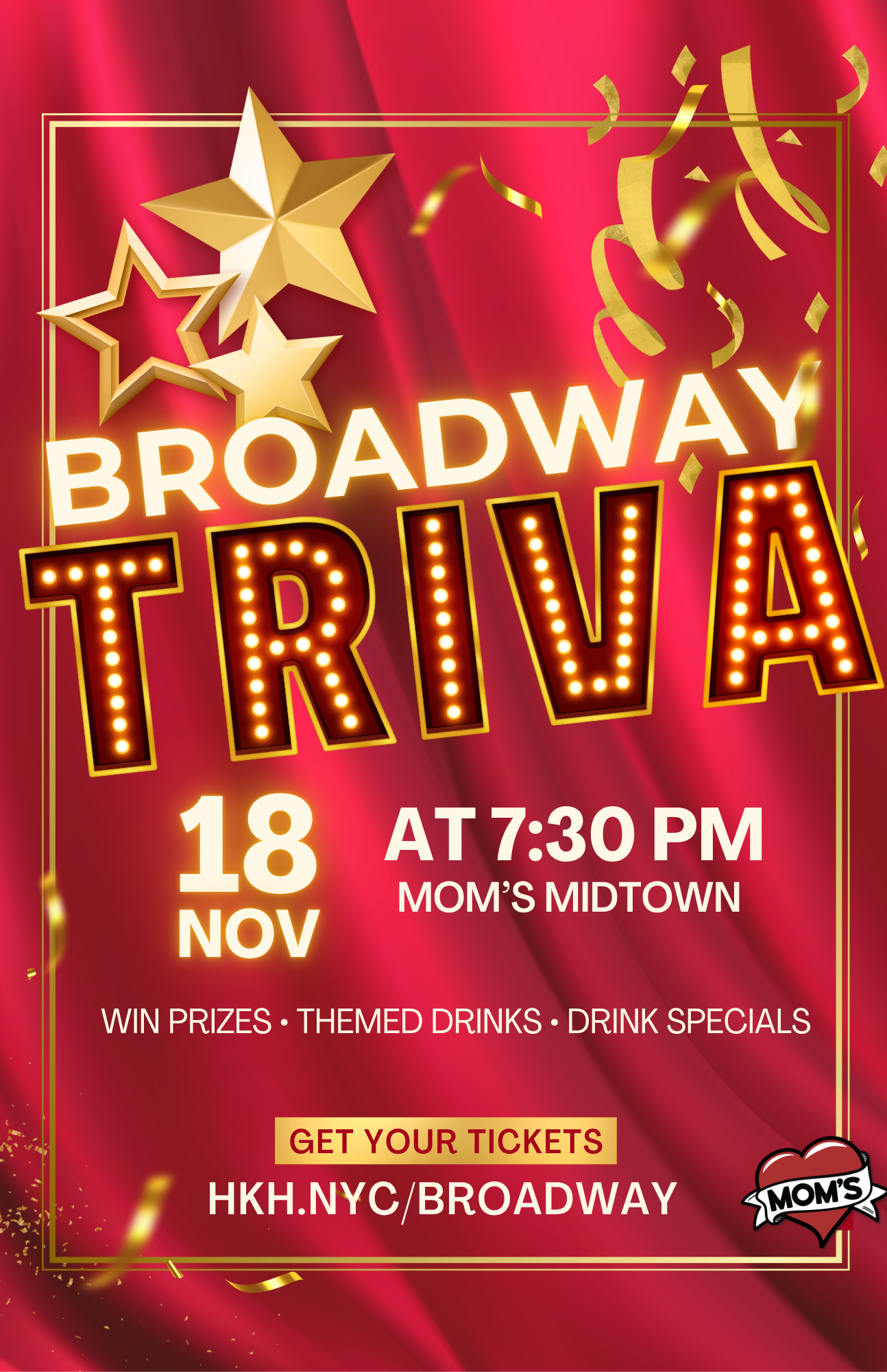 Think you know your musicals from your plays, your show-stopping solos from your classic duets. Join us for a night of lights, laughs and a little drama! Mom's is hosting and testing all your Broadway knowledge. Gather your castmates grab a specialty cocktail, and get ready for a great Trivia night right here in Midtown.